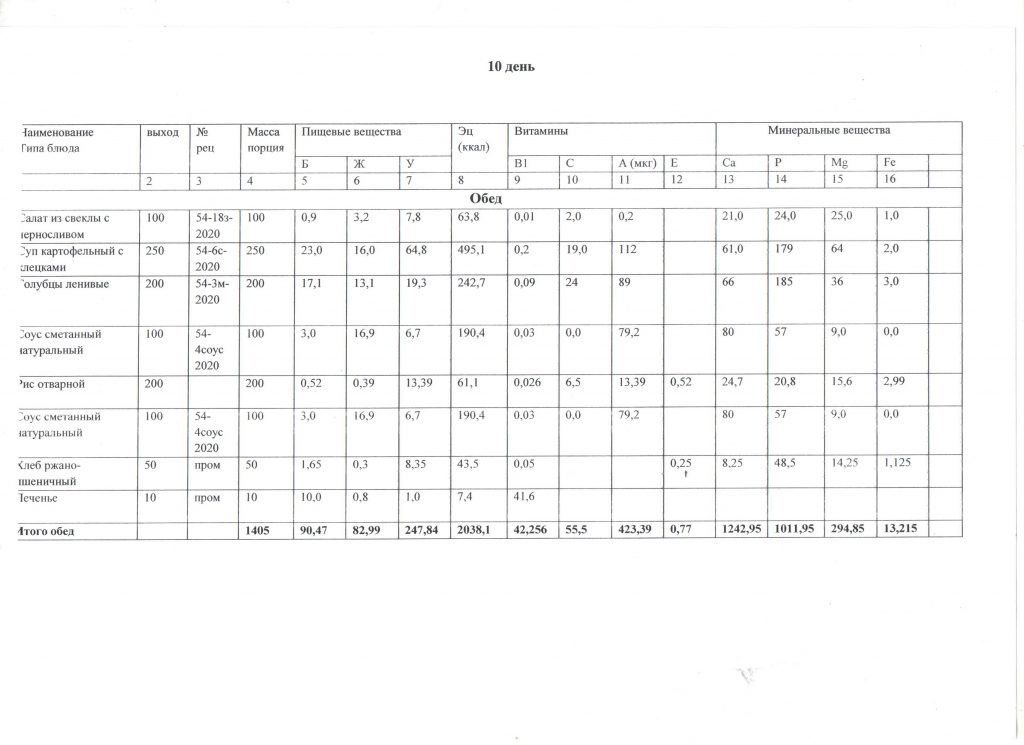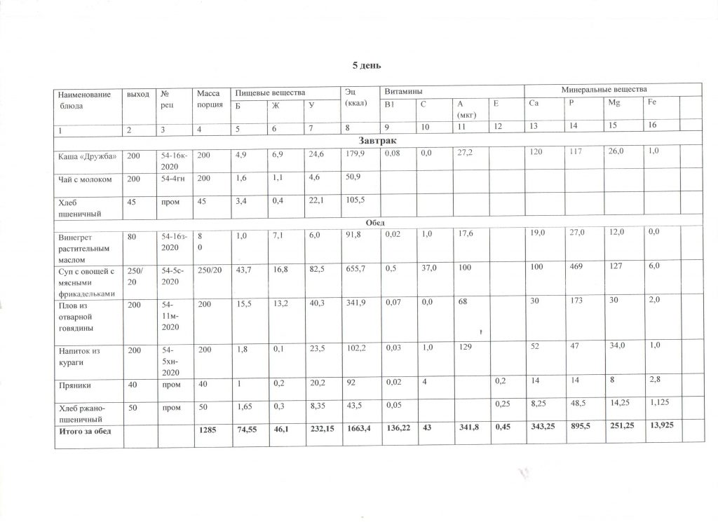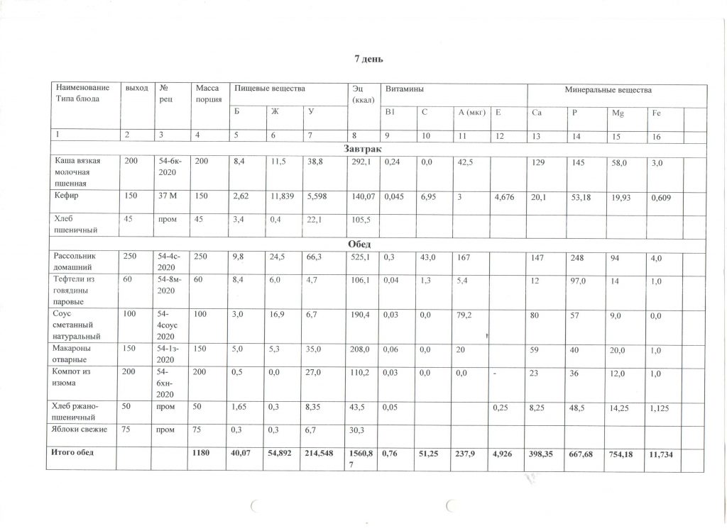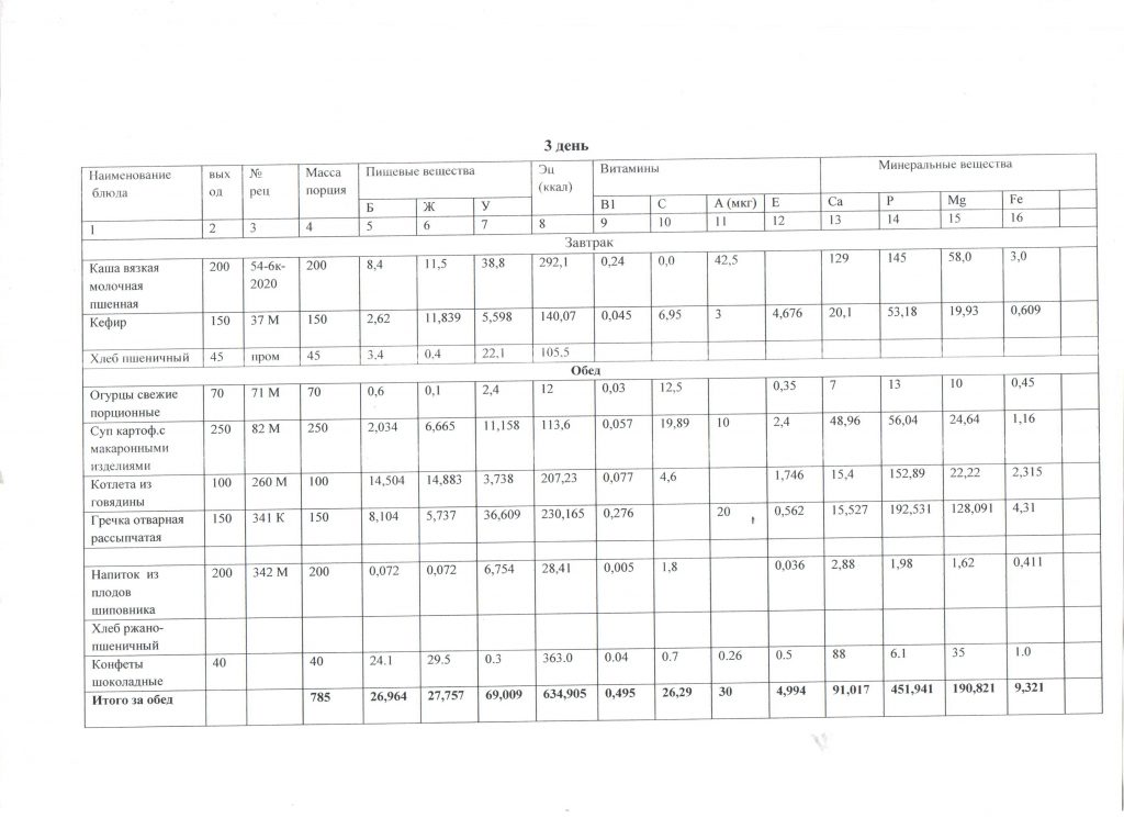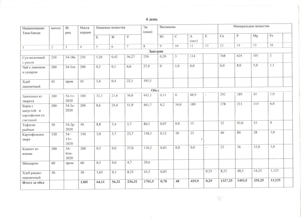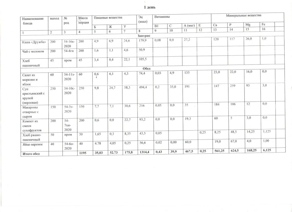 Меню детей для начальных классов