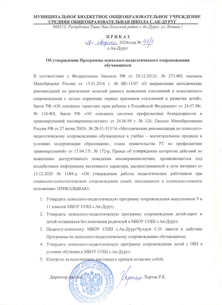 — Приказ школы Об утверждении программы психолого-педагогического сопровождения обучающихся МБОУ СОШ с.Ак-Дуруг;