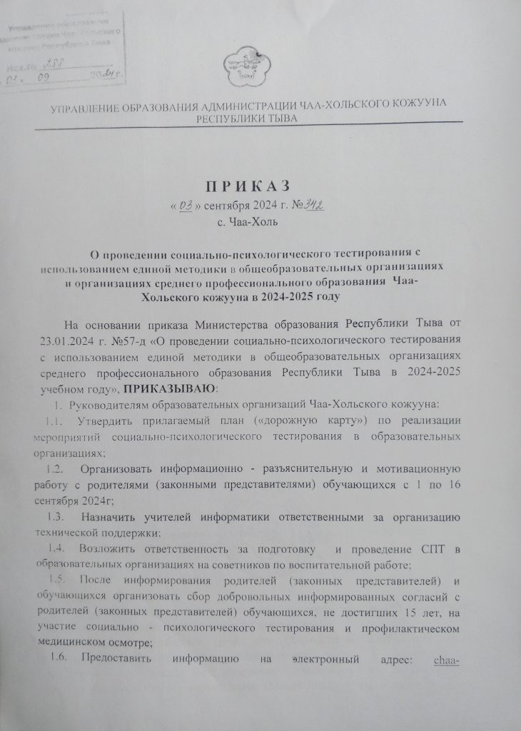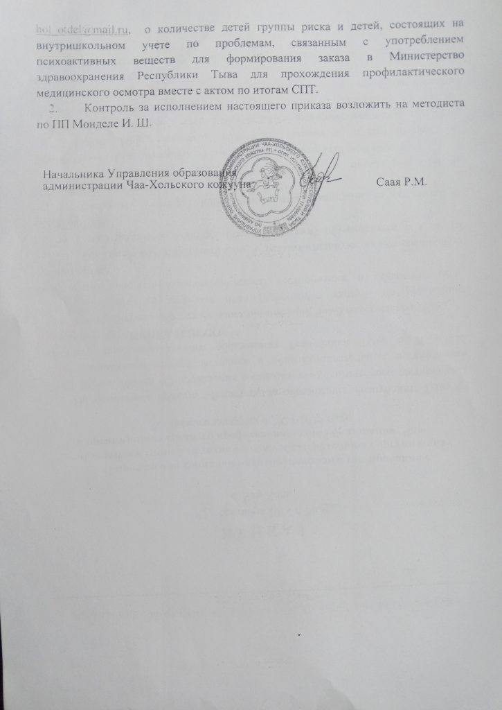— приказ СПТ Управления образования Администрации Чаа-Хольского кожууна;