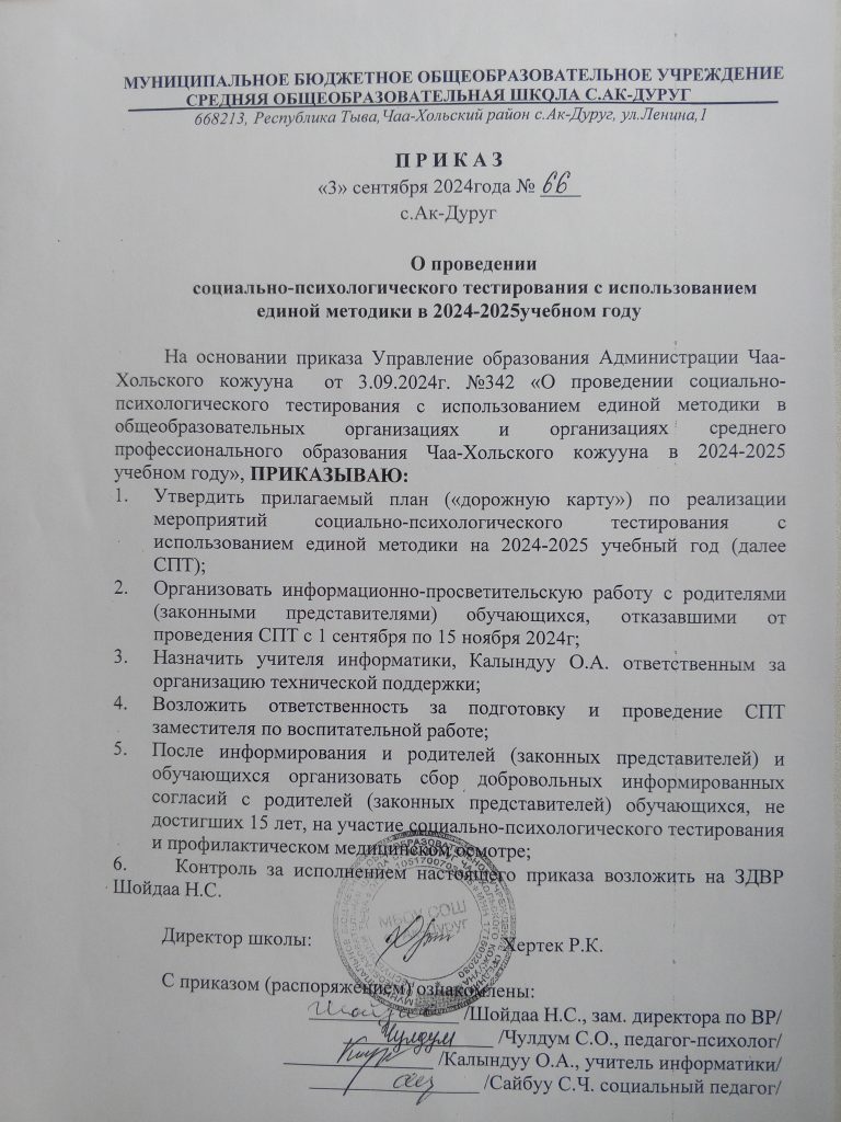 — приказ СПТ школы «О проведении СПТ с использованием единой методики в 2024-2025 у.г.»;